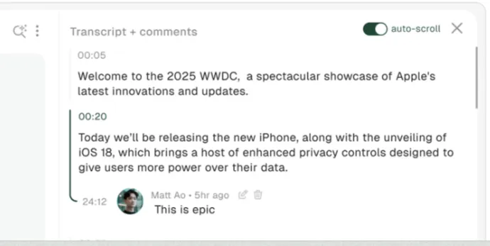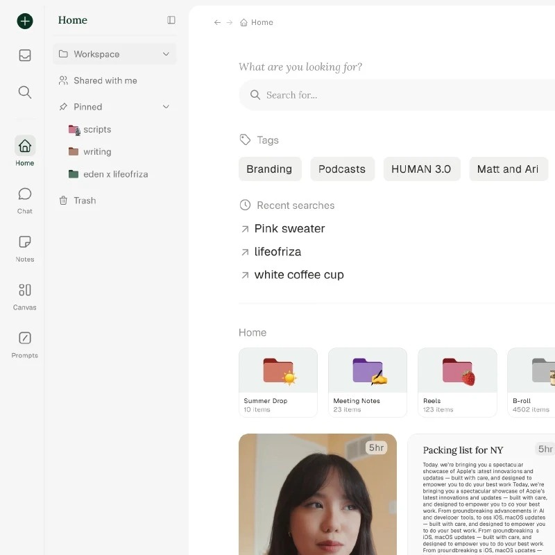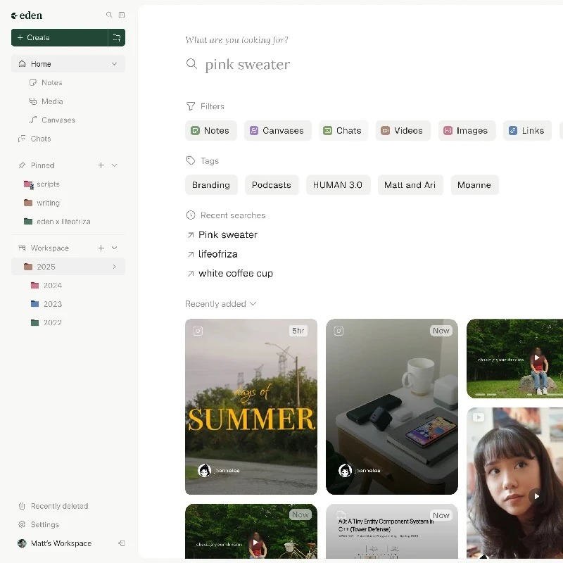 Everything you add to your workspace is automatically transcribed, tagged, downloaded, and ready to reference with AI.